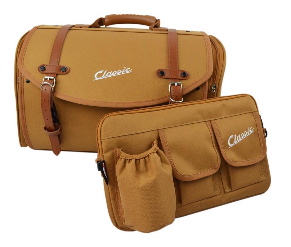 Luggage compartment bag SIP "Classic". Practical luggage compartment bag for attachment to the glove/luggage compartment lid. Quick access to important documents like toll ticket for highway, map, smartphone, camera etc. without annoying searching in the luggage. Glove compartment / luggage compartment can still be opened and closed without removing the bag. There are three compartments on the front. 2x plug-in compartments with Velcro lid, 1x universal net for drink bottle or similar. Another large zippered compartment offers plenty of storage space for gloves, wallet, map, etc.. This is additionally divided into two organizer mesh compartments and a separately separated zipper compartment. Through adjustable carrying strap also usable as a practical shoulder bag. Fastening by means of three Velcro straps. Holds securely & tightly. Embroidered "Classic" logo.