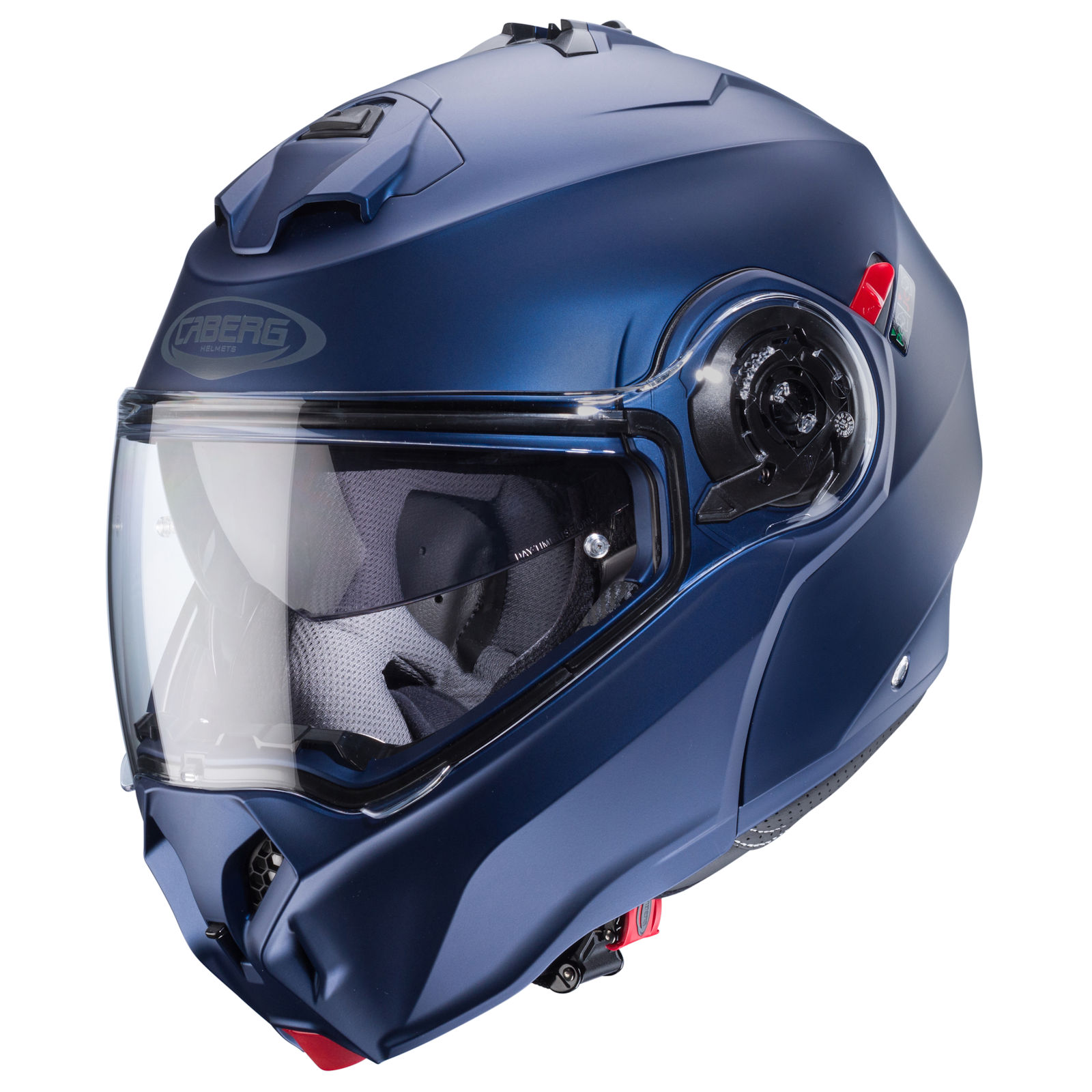 The Caberg Duke Evo flip-up helmet is a modern flip-up helmet that combines safety, comfort and versatility. It complies with the ECE 22.06 standard and is P/J-certified, which means that it can be used as a full-face helmet with the chin section closed or as a jet helmet with the chin section open. A lever on the left-hand side fixes the chin guard in the open position and prevents it from closing unintentionally while riding. The helmet shell is made of lightweight polycarbonate and weighs around 1,600 grams, which, combined with the ergonomic fit, guarantees a comfortable fit. The inner padding is breathable, hypoallergenic and fully removable and washable, making it particularly easy to clean. An advanced ventilation system with controllable inlets on the chin and top of the head and air outlets at the back of the head ensures optimum air circulation even on long rides. The Duke Evo features the Double Visor Tech system with a scratch-resistant main visor and an integrated sun visor that is easy to operate. The helmet also comes with a Pinlock® 70 anti-fog lens, which guarantees fog-free vision in all weather conditions. For modern communication, the Duke Evo is compatible with the Caberg Pro Speak Evo Bluetooth system, which enables calls, music streaming and navigation with GPS. The Duke Evo is a helmet for demanding riders who value technology, comfort and safety.