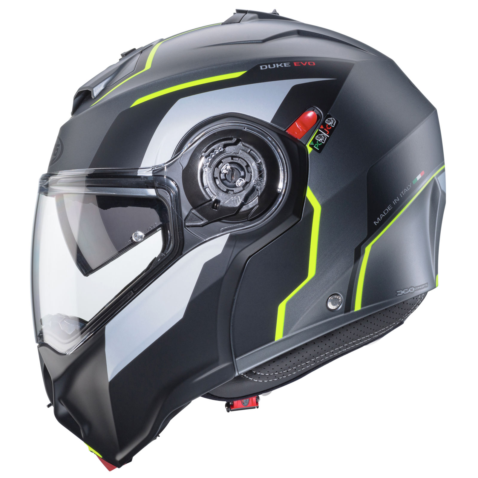 The Caberg Duke Evo flip-up helmet is a modern flip-up helmet that combines safety, comfort and versatility. It complies with the ECE 22.06 standard and is P/J-certified, which means that it can be used as a full-face helmet with the chin section closed or as a jet helmet with the chin section open. A lever on the left-hand side fixes the chin guard in the open position and prevents it from closing unintentionally while riding. The helmet shell is made of lightweight polycarbonate and weighs around 1,600 grams, which, combined with the ergonomic fit, guarantees a comfortable fit. The inner padding is breathable, hypoallergenic and fully removable and washable, making it particularly easy to clean. An advanced ventilation system with controllable inlets on the chin and top of the head and air outlets at the back of the head ensures optimum air circulation even on long rides. The Duke Evo features the Double Visor Tech system with a scratch-resistant main visor and an integrated sun visor that is easy to operate. The helmet also comes with a Pinlock® 70 anti-fog lens, which guarantees fog-free vision in all weather conditions. For modern communication, the Duke Evo is compatible with the Caberg Pro Speak Evo Bluetooth system, which enables calls, music streaming and navigation with GPS. The Duke Evo is a helmet for demanding riders who value technology, comfort and safety.
