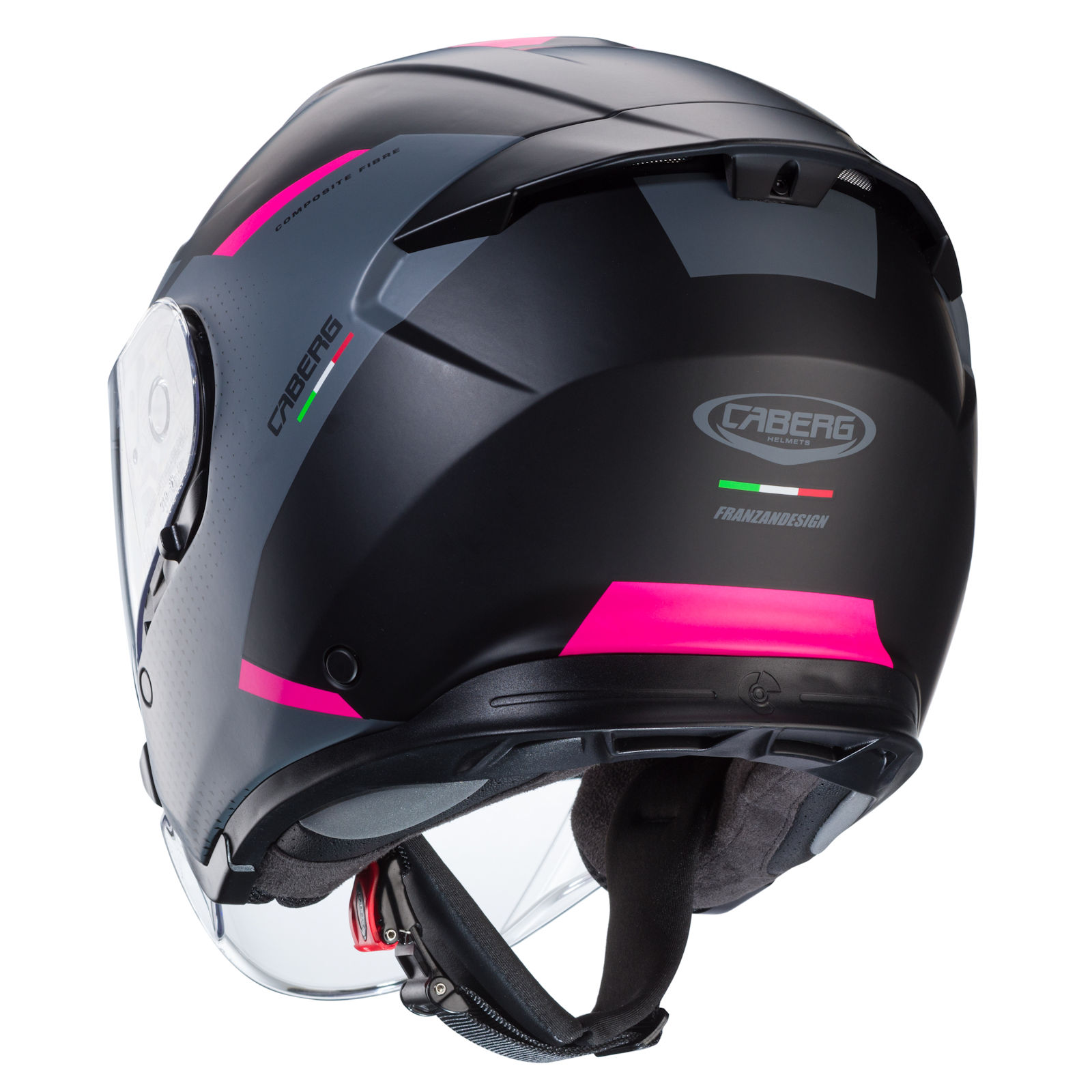The Caberg Flyon II jet helmet with Boss decor in matt black/grey fuchsia has the following features:
