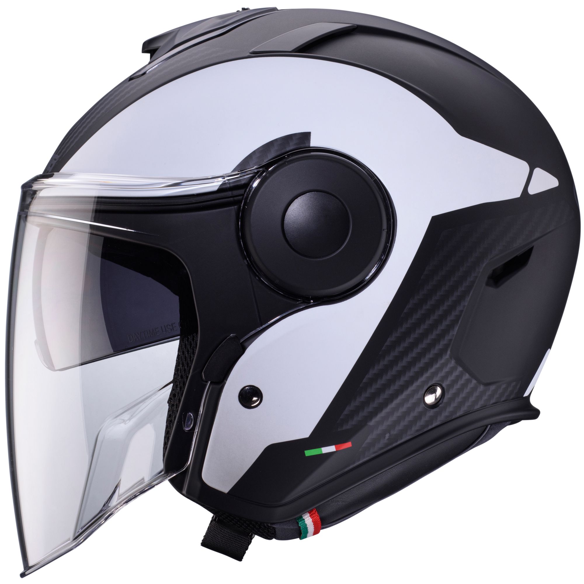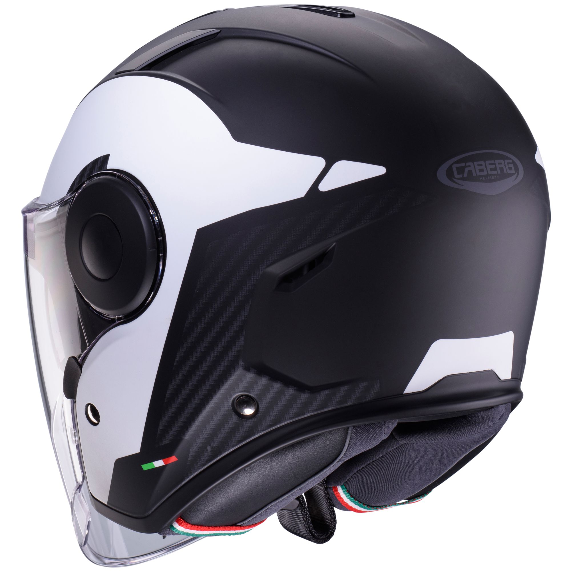 The Caberg Soho jet helmet with the Milano decor in the colors matt black/white has the following features: