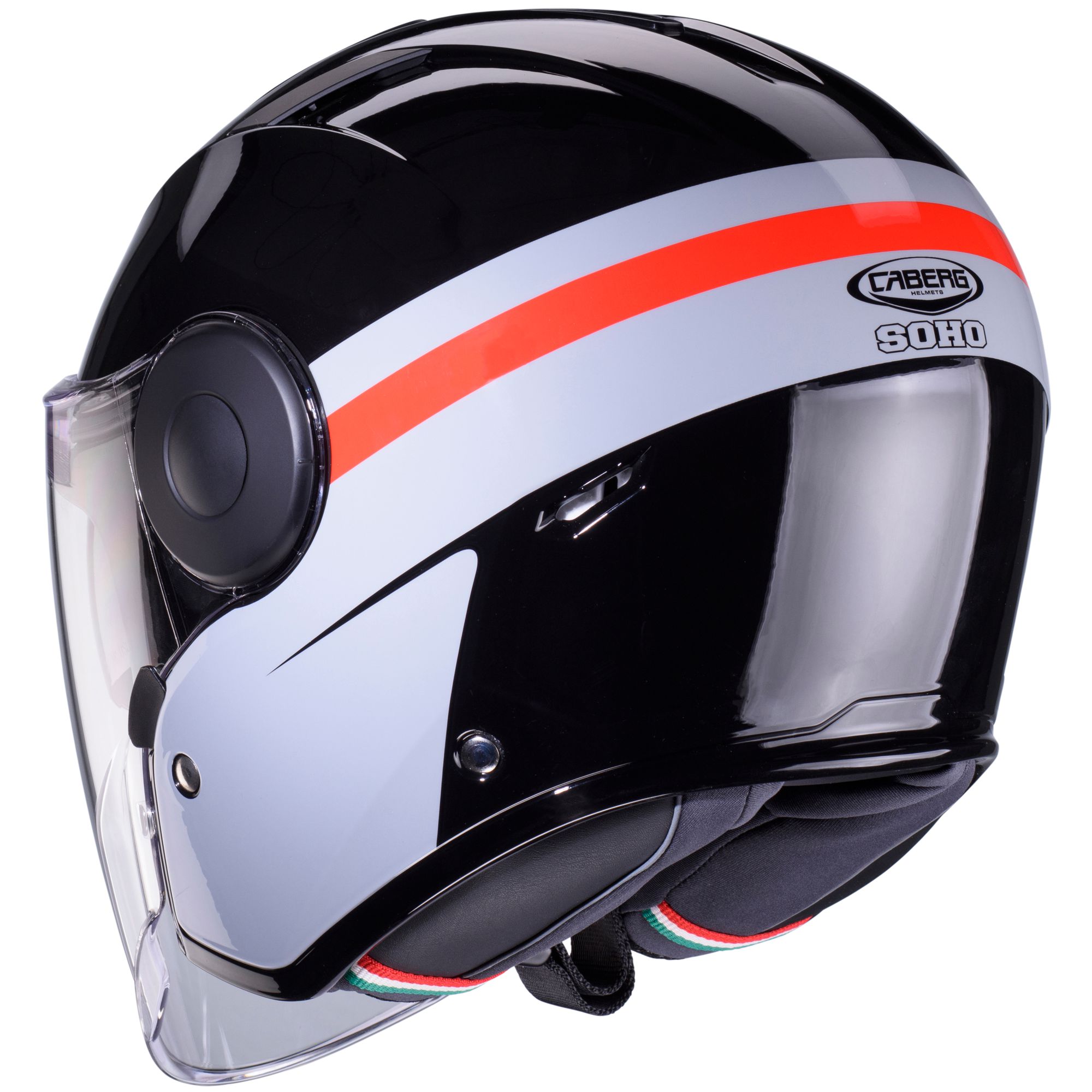 The Caberg Soho jet helmet with Zephyr decor in black/grey-red has the following features: