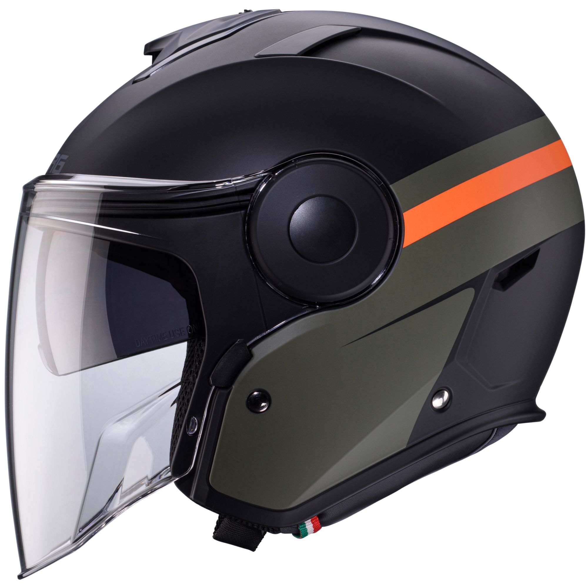 The Caberg Soho jet helmet with Zephyr decor in matt black/green-orange has the following features: