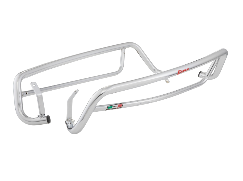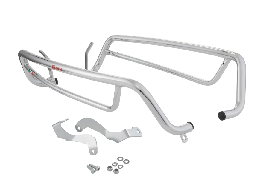 The crash bars for the side hood are mounted on the underbody of the Vespa, thus the legroom of the pillion rider is not restricted. At the rear, a retaining plate is mounted under the license plate holder / splash guard, to which the bar is attached. Due to the attachment, the crash bars do not appear very stable and the protective effect in the event of a serious fall is not optimal.