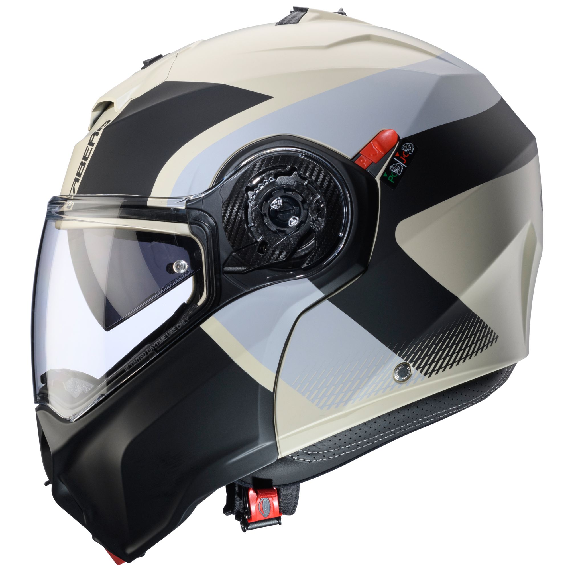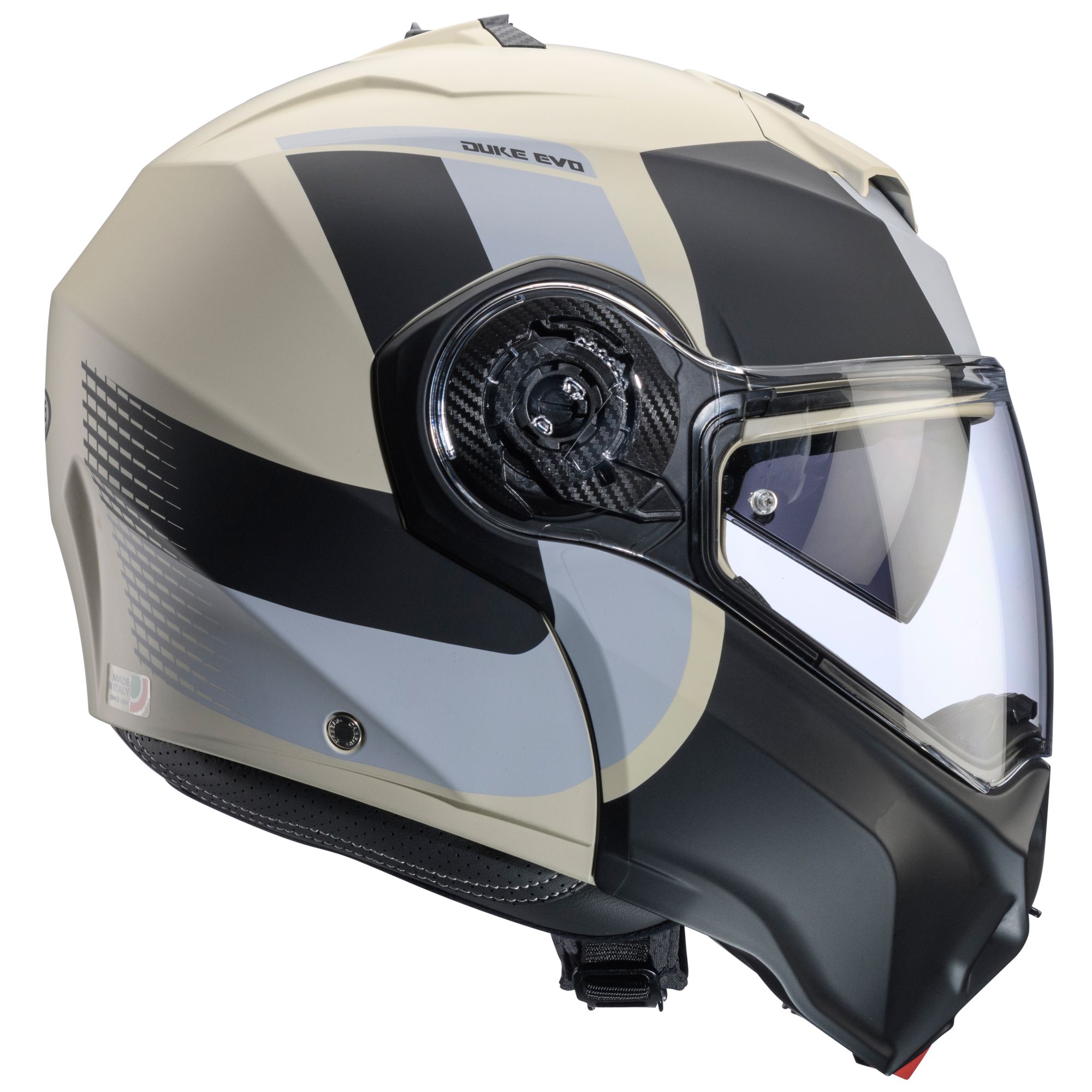 The Caberg Duke Evo flip-up helmet with the Indy decor in the colors matt sand/black-grey has the following features: