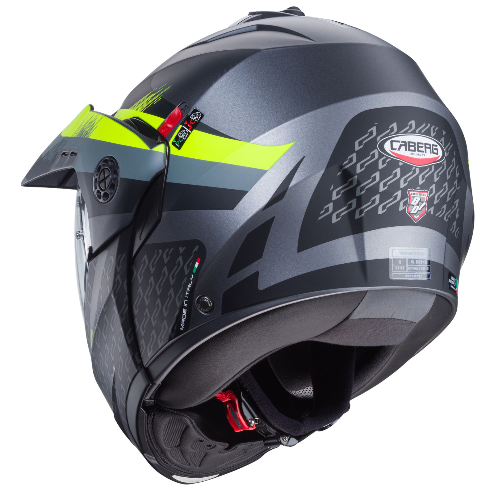 The Caberg Tourmax X helmet is a flip-up adventure helmet specially developed for enduro motorcyclists. This comfortable flip-up helmet, tested in accordance with the current ECE 22.06 standard, offers the option of riding with the front part open or closed. A practical lever in the "J" position locks the chin guard in the fully open position and prevents unintentional closing - ideal for maximum safety and flexibility. This flip-up helmet is ideal for both demanding off-road tours and relaxed country road trips on vacation. The chin section can be folded up and securely fastened with just one hand movement. Both wearing options - open and closed - have been extensively tested (dual homologation) to meet the highest safety standards. Comfortable and functionally equipped, the helmet with its removable, breathable and washable inner lining and individually adjustable ventilation in the chin and forehead area ensures a pleasant riding experience, even on long tours. The Pinlock® double visor, together with the integrated sun visor, ensures a clear view at all times. The helmet can be optionally equipped with a Bluetooth system for additional entertainment, navigation and communication.