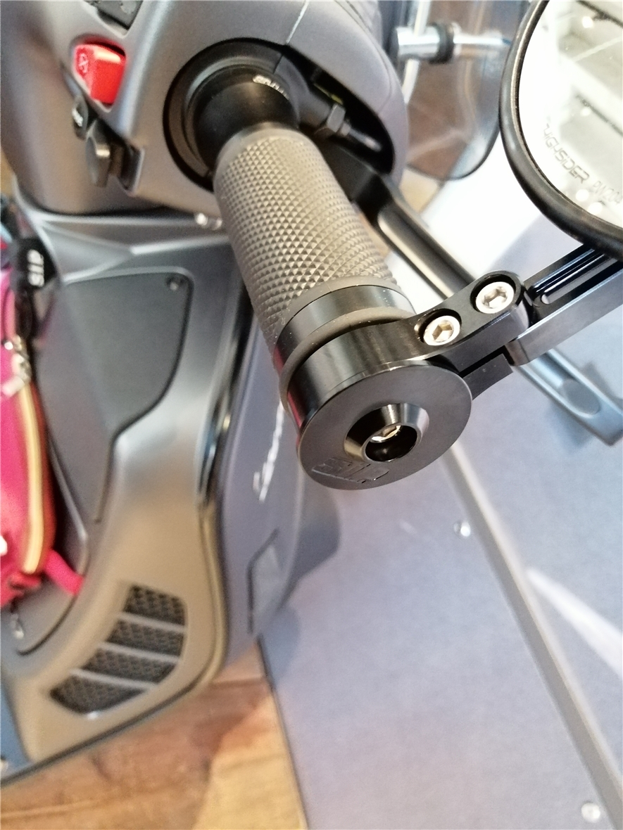 To mount handlebar end mirrors, a "handlebar end opening" grip and mounting kit is required. This serves as a handlebar extension for mounting the mirrors. The adapter is placed at the end of the handlebar and fixed with an M6 screw in the handlebar. The handlebars of the Vespa GTS models already have a factory M6 thread to fix the adapter. For all other models, a thread may have to be recut. For two handlebar end mirrors, two mounting kits are also required. High quality manufacturing from aluminum CNC, anodized.