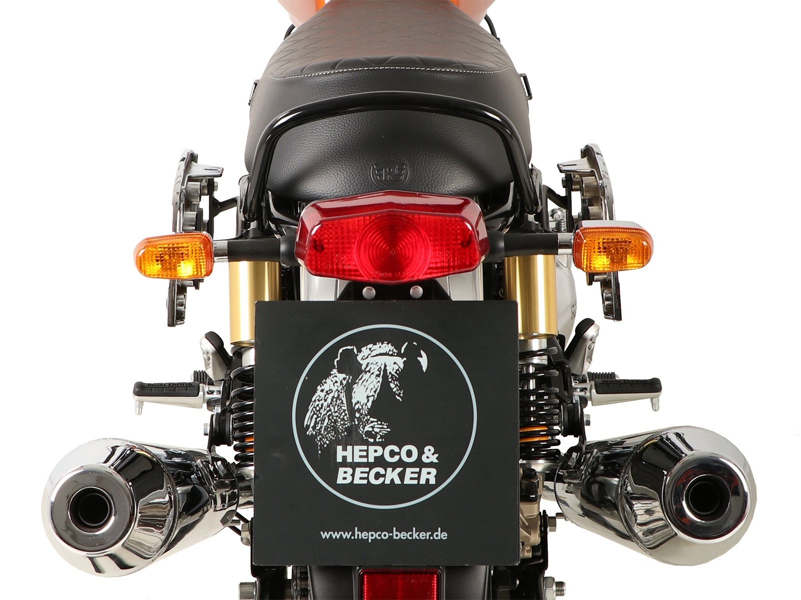 All Hepco&Becker side bags, leather bags or cases with C-Bow mount can be attached to the motorcycle using model-specific C-Bow carriers. The unobtrusive and elegant design fits perfectly into the overall line of the vehicle. A sufficient safety distance of the bags to the hot tailpipe of the exhaust is self-evident. Thanks to the C-Bow technology, the matching bags are quickly and easily attached to the C-Bow carrier with just one click and are theft-protected and firmly locked by key. The bags are firmly attached to the motorcycle and remain in position even when loaded. The turn signals remain mostly in original position. Please note the deposited mounting instructions and model-specific instructions.