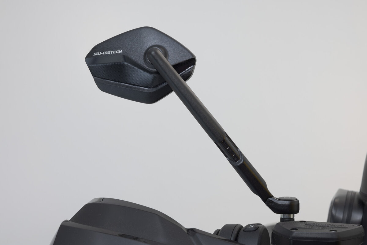 SW-MOTECH manufactures the adjustable mirrors in a modern and flat design from black anodized aluminum. The mirror arms consist of continuously adjustable elements and are each extendable by 30 millimeters. The multiple adjustment possibilities of the mirrors give the pilot more safety through a better overview of his surroundings.