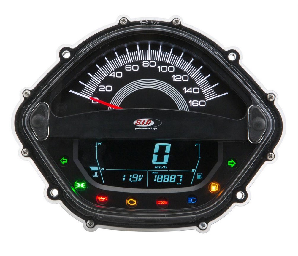 The SIP speedometer / tachometer replaces the standard very sparsely equipped speedometer with a real multifunction device. The speedometer impresses with its large analog display for speed (up to 160kmh) and rpm (up to 16,000 rpm). Accordingly, the speedometer needle displays either RPM or speed. The lower digital display can optionally show 18 functions. These can be switched over at the push of a button. In addition to the standard functions such as analog / digital speed display, trip & total kilometers, temperature, the speedometer has an analog & digital tachometer, digital fuel and temperature display, accelerometer for distance and speed measurement, average speed and many other features (see function list). The backlight can be selected from eight different colors. The brightness can also be regulated separately. Before each restart, the instrument performs a complete self-test. The speed pickup is done as original via the speed pickup integrated in the wiring harness or can be transmitted via a digital speed sensor. The appropriate sensors are available as accessories. A cable set for connection to the vehicle is included. This is connected between the speedometer and the wiring harness. Everything without soldering, simple and uncomplicated.